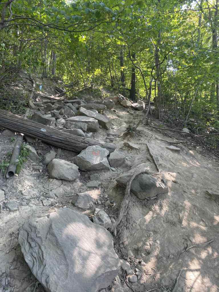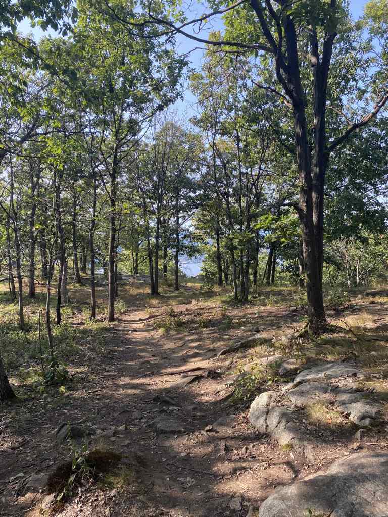 After the third (or fourth? I’m not sure which ones count) summit, the trail regains some foliage and actually drops the elevation briefly. This only creates a few more feet to climb upward, before reaching a maximum elevation around 1,225 feet. Coming from just 50 feet above sea level next to the Hudson River, there’s over 1,175 feet of elevation to be gained on this hike!